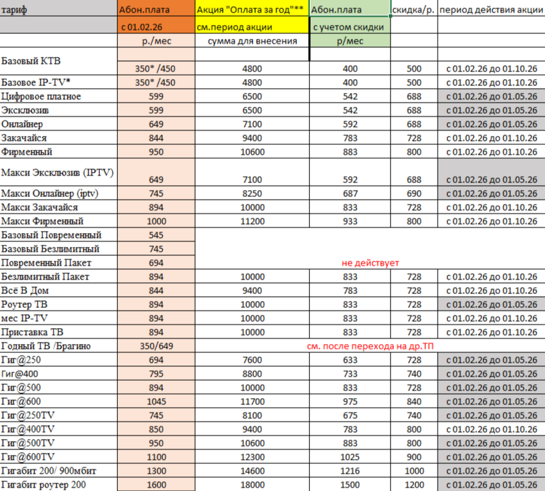 Акция доступна абонентам сети АТЭЛ в период с 1.12.25 по 30.01.26. Абонент выбирает период участия в акции и вносит на счет необходимую сумму (см. таблицу) по своему тарифу, баланс на время внесения должен быть положительным. После пополнения баланса, необходимо сообщить Оператору об участии в акции, иначе скидка не будет применена. Абонент может принять участие только в одной акции, акции не суммируются. В случае приостановки, расторжении договора, акция аннулируется, перерасчет идет по полной стоимости тарифа.